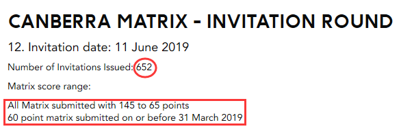 邀请数量方面:此轮是2018-19财年最后一轮邀请,堪培拉政府也是特别慷慨,邀请量达到Matrix邀请史上之最。估计是部分申请人未在规定时间内递交州担材料或是Matrix递交的分数与实际不符造成邀请作废导致ACT配额浪费,所以ACT次轮发放大量邀请,共计652人,对于ACT州担申请人来说是绝对的好消息。