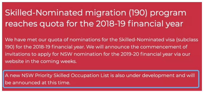 NSW 190州担保由于已经达到预计上线,目前已经关闭!此外,今日得知的消息表示:新财政年190州担保职业清单正在制定当中,并将很快宣布。