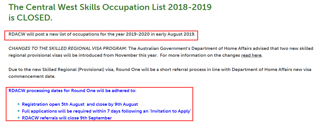 Central West近期也在官网发布声明表示:正在制定新的职业清单,并将于8月初发布。但由于在11月16日要引入新偏远地区签证,所以Central West新财年的第一轮邀请将于8月5日-9日,仅仅开放4天!
