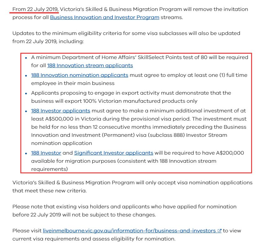 注意:如果在2019年7月22日前已经获取了上述188类签证或已经递交了维州政府提名申请的申请人将不会受到上述新政的影响。