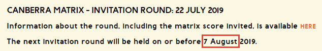 在Matrix评分系统获得邀请只是获得堪培拉州担保的第一步,希望获得邀请的朋友尽快将全部相关材料准备好去递交堪培拉190州担保申请,并支付审理费。请注意:必须是在14天内递交全部相关材料,否则邀请将作废。