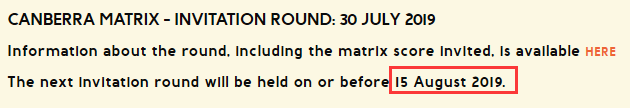 在Matrix评分系统获得邀请只是获得堪培拉州担保的第一步,希望获得邀请的朋友尽快将全部相关材料准备好去递交堪培拉190州担保申请,并支付审理费。请注意:必须是在14天内递交全部相关材料,否则邀请将作废。
