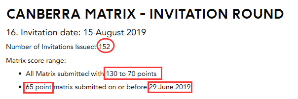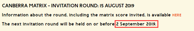 本轮是新财年第四轮邀请,邀请数量较此前有所减少,邀请分数还是和上轮一样,但是65分邀请仅推进了1天。这样看来,堪培拉政府的邀请要走保守路线了,为签证变化过渡做准备。小编在这里要提醒大家,目前ACT堪培拉担保190签证,但是由于偏远地区重新划分,11月16日新政实施后ACT将也能担保491签证了,技术移民申请人通过ACT堪培拉担保也将有机会获得偏远地区491 TR签证。想获得ACT 190邀请的朋友,保险起见赶紧将Matrix打分凑到70分递交吧,这样才能在下轮获邀!