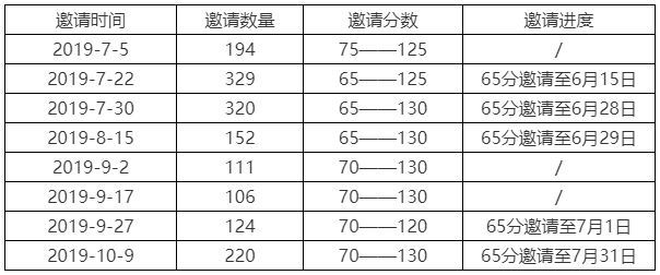 邀请分数:所有70分—130分,65分邀请至7月31日