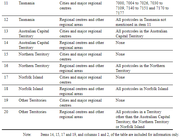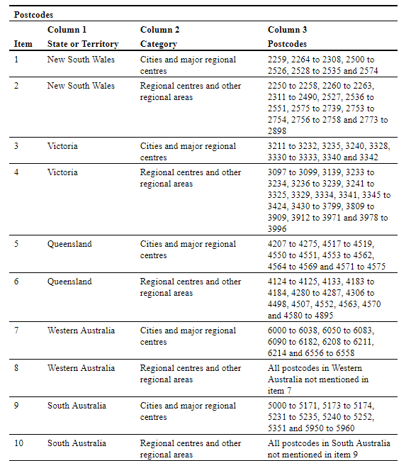 包括的地区有:除悉尼、墨尔本、布里斯班以及上述提到的偏远地区主要城市与中心地区外的所有地区