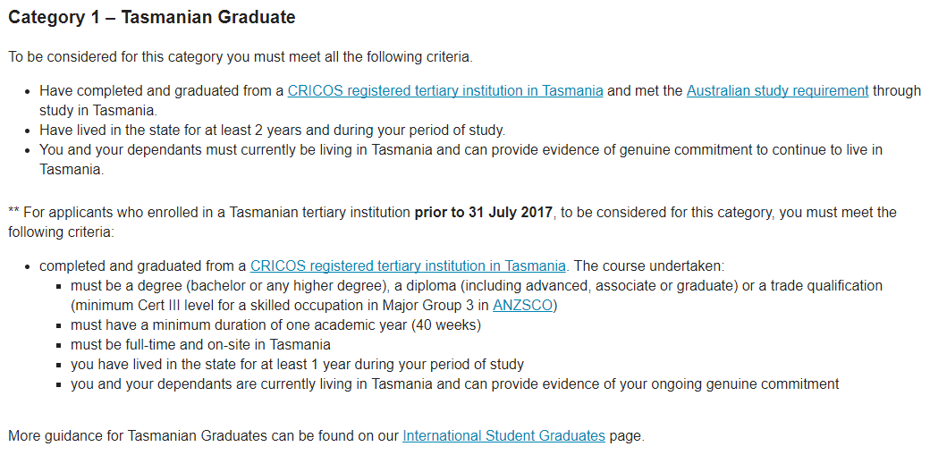 l 在塔州本地完成全日制CRICOS注册课程,时长至少2学年(80周),学历等级为本科及以上,diploma(advanced,associate or graduate)或者技工课程(至少Cert III level, ANZSCO Major Group 3中的技工职业);