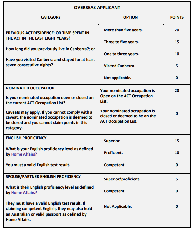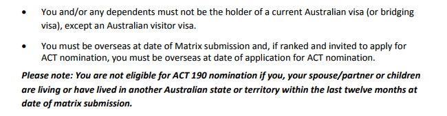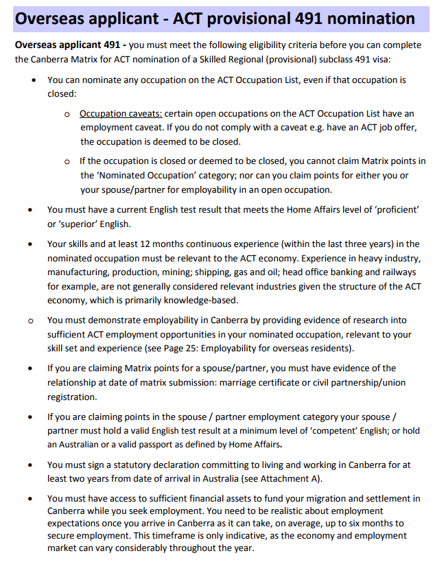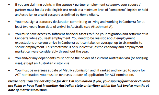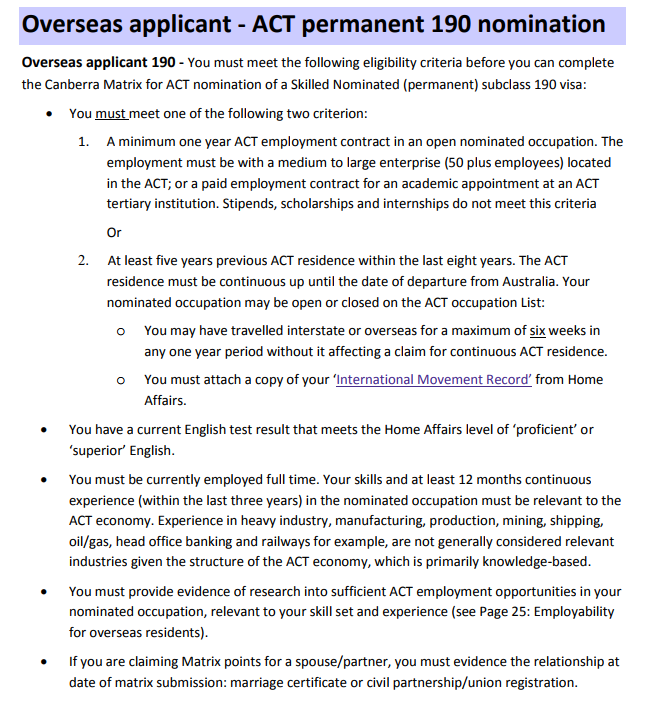 1. 至少一年ACT雇主(提名Open职业)的工作合同,雇主为ACT当地的大中型企业(员工50人以上);或一份来自ACT高等教育机构任教的带薪的工作合同;或