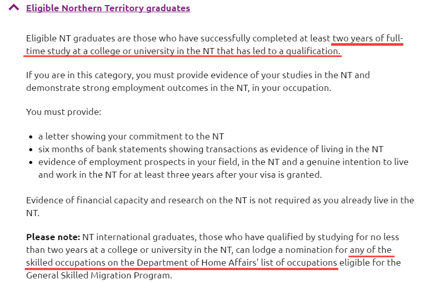 申请人需要在北领地完成至少2年全职学习并拿到学位。可以提名移民局职业清单中的任何职位,不受北领地清单的限制。递交州担保申请时需要提供在NT学习和提名职业工作的证据: