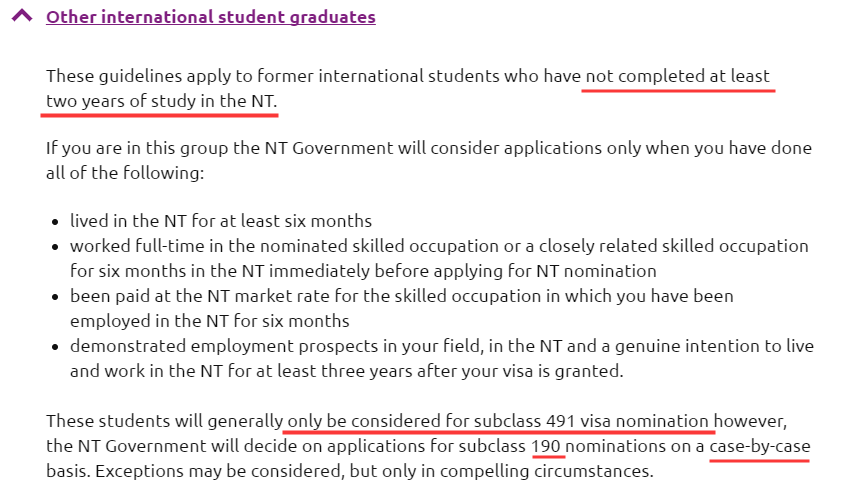 此类别主要适用于未在北领地完成2年学习的学生,仅可申请491州担保,只有在特殊情况下才会给个别外州毕业生批准190州担保。国际毕业生在递交NT 491州担保申请前需要满足下列条件: