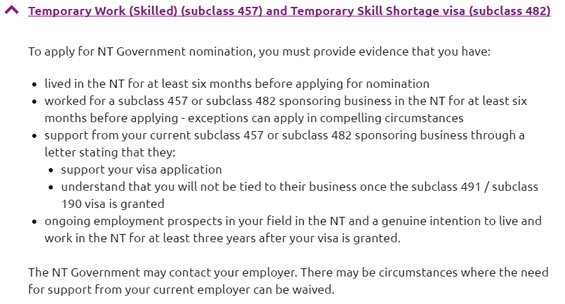 对于持有457或482雇主担保签证的申请人,申请北领地州担保时需要满足: