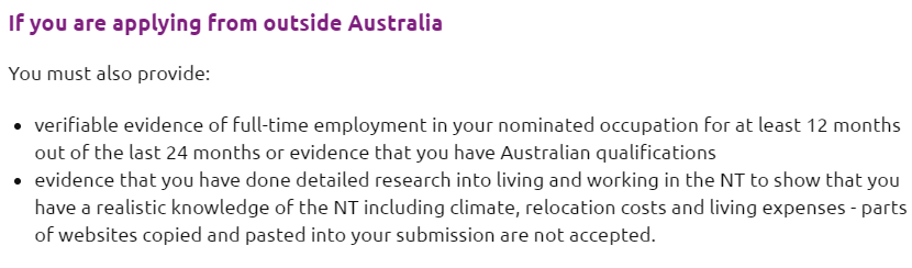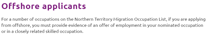对于提名北领地职业名单上的职业,如果申请人是海外申请人,需满足NT职业清单上此职业对offshore申请人有额外的要求,例如需提供与提名职业密切相关的雇主Offer或英语成绩要求等,详情见职业清单上各职业后面的标注。