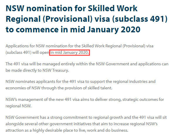 今天上午,新州官网公布了491州担保的具体细则,将从2020年1月中旬正式开放NSW 491州担保申请。