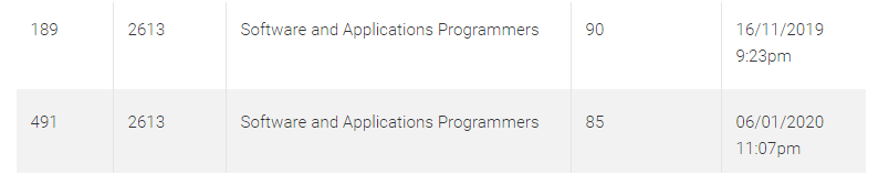 2613软件和应用程序员本轮共邀请288人。189 90分获邀,邀请到2019年11月16日,较上轮推进了1个半月。491亲属担保85分获邀,邀请到2020年1月6日,较上轮降低了10分。