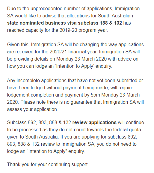 鉴于巨大的申请数量,南澳州政府表示,将改变下一个财政年(2020-2021)商业移民签证申请的接受方式,采用先递交‘Intention to Apply’的方式。