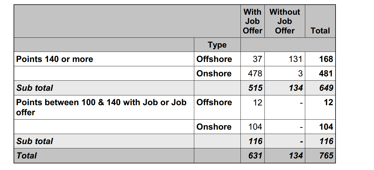 从数据可见,offshore的申请人中,没有job offer的,依然必须要超过140分,才会被邀请。.png)