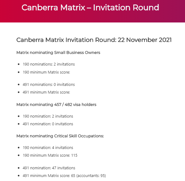 要注意的是,457/482签证持有者类别仅需65分即可获得邀请去申请提名,而小生意主和关键职业类别是根据Matrix打分排名,择优录取。分数越高,将有机会更早获邀。