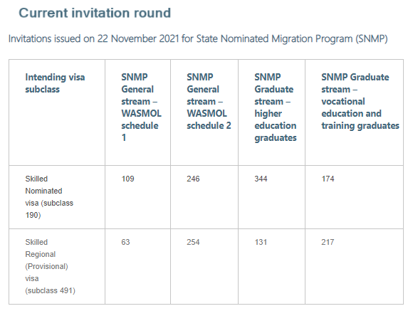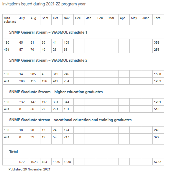 2021-22财年,西澳190州担的配额为1,100个,491州担的配额为340个,与上财年一致。而截止到11月29日,190邀请发放了3377个,491邀请发放了2355个,总共发放了5732个邀请,已经远远超出计划配额。