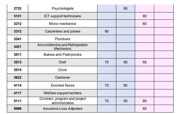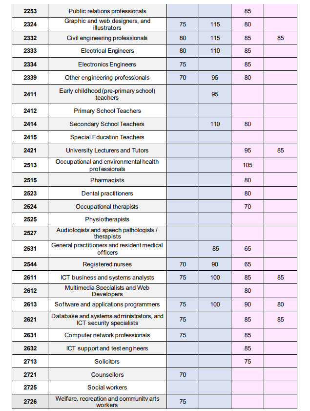 在获邀分数方面,我们可以看到境外190邀请较少,需要80分以上才能获邀,但是境外申请491邀请到的职业非常多,几乎70%~80%的职业都有被邀请到,很多都是以往在境内申请获邀职业里从未被邀请的职业,例如广告/PR/销售经理、GP、餐饮/服务/零售业经理、汽车修理师、中学教师、建筑业经理等等,并且境外491的邀请分低至65分即可,主要集中在80~90分,最低65分可获邀的职业包括厨师、保险理赔员、汽车修理师、注册护士、GP等,其中厨师和注册护士的境内491获邀分数本轮需要70~75分,境外申请妥妥地占优势!境内190最低分85分起步,仅GP只需85分,工程类职业需要110~115分!会计110分,少量IT职业获邀,需要100分,其他大部分为90~95分。境内491原先最低65分基本就能稳获邀,本轮都涨至70~75分了,境内491的会计需要100分,工程类职业70~80分不等,IT类职业75分。