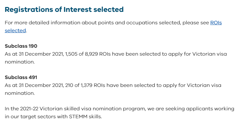 本财年配额是3500个。截止到2021年12月31日,维州190共计收到8929份ROI申请,其中1505份ROI被邀请递交维州州担保正式申请,1444份申请已顺利获邀并递交了维州190州担保签证。