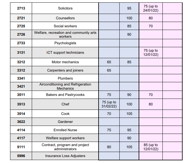 本轮获邀的职业也非常多,并且邀请分数也比上轮降低了不少,回到正常范围。热门职业会计/审计、IT类、工程类、厨师、幼教/中教、社工、餐厅/咖啡店经理等都有邀请,境内491最低65分,大部分在70~85分可获邀,190最低分85分获邀,例如广告/市场/公关专员,社工和ICT支持和测试工程师。境外190 的邀请分数在75~85分,1399专家经理75分,ICT manager80分,餐厅酒店经理和土木工程85分,境外491也是最低65分获邀,包括注册护士,已经审理至2022年1月18日递交的申请,还有众多70~85分获邀的,大部分热门职业的分数都在这个区间内,例如餐厅经理70分,客服经理/中学教师75分,HR经理/平面和网页设计师/多媒体专家/厨师80分,会计/财务经理/土木/电气/电子工程85分。