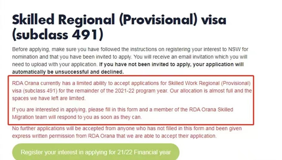 上周,新州Orana地区才发公告“RDA Orana is no longer able to accept application for Skilled Work Regional (Provisional) visa (subclass 491) for the remainder of the 2021-2022 program year”,称本财年的491配额已经用尽,不再接受新的申请。