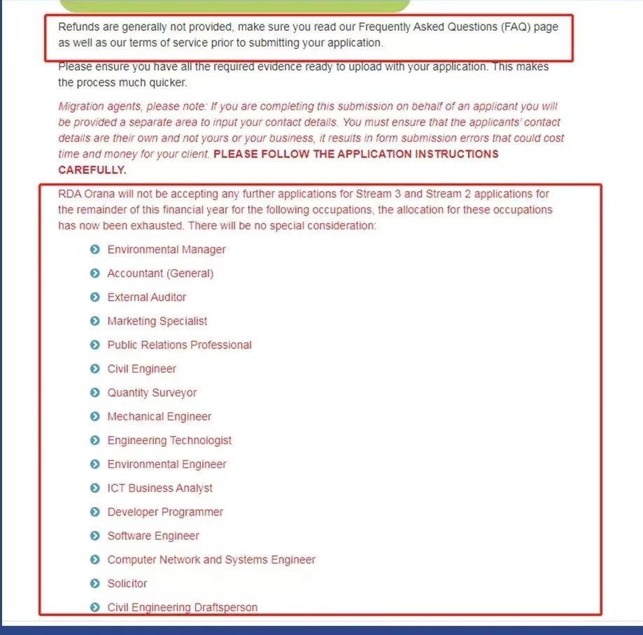 以及,本次申请中,RDA Orana将不再接受以下职业的Stream 2和Stream 3申请。这些职业包括:环境经理、会计、外部审计师、营销专家、公共关系人士、土木工程师、