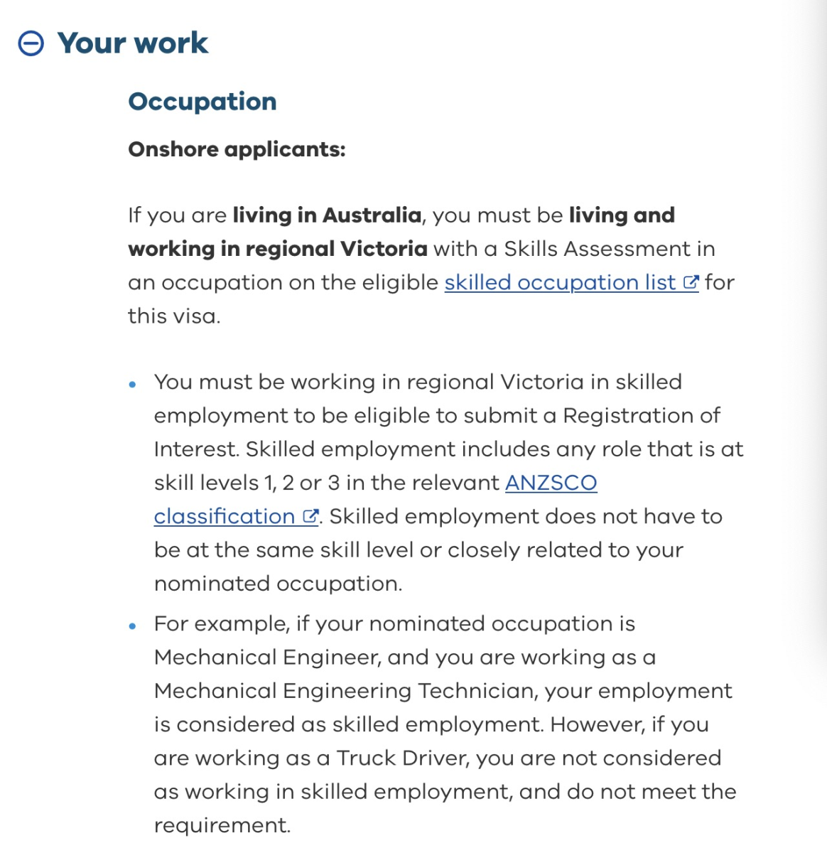 -您必须在维州偏远地区从事技术工作才有资格提交ROI。技术性工作包括在ANZSCO分类中处于1、2或3级技能水平的任何职业。