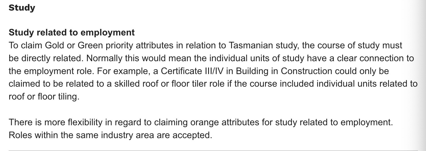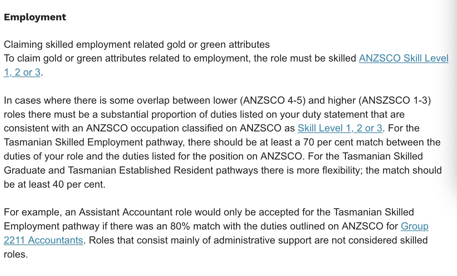 -申请人在塔州从事的工作在ANZSCO Skill Level 1-3上才能获得GOLD/GREEN优先级