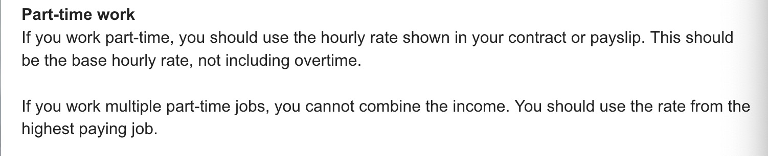 -如果申请人从事兼职工作,应使用合同或工资单上显示的的基本时薪来计算,不包括加班费