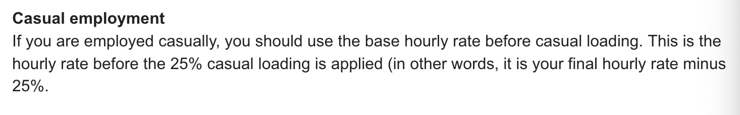-如果申请人是临时受雇,应使用基本时薪而不是casual loading(即最终时薪减去25%)