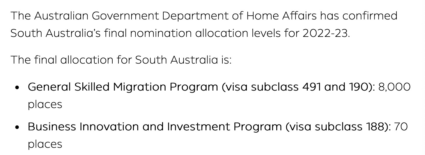 自移民局官网在12月初公布了各州最终州担配额之后,南澳州政府于上周在官网对南澳最终配额作出了进一步说明。