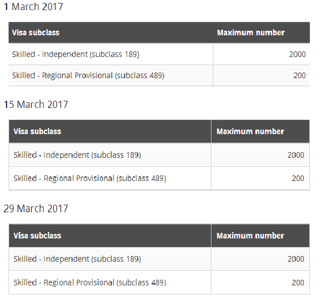 2017年3月份移民局EOI邀请将有3轮,分别在3月1日,3月15日,3月29日,每轮都将发出2000份189签证邀请,200份489签证邀请。