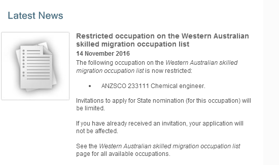 11月14日西澳移民官网发出通知:ANZSCO 233111 Chemical Engineer 调整为restricted,申请此职业将不能获得新的州担保邀请,已获得邀请的申请者不受影响。